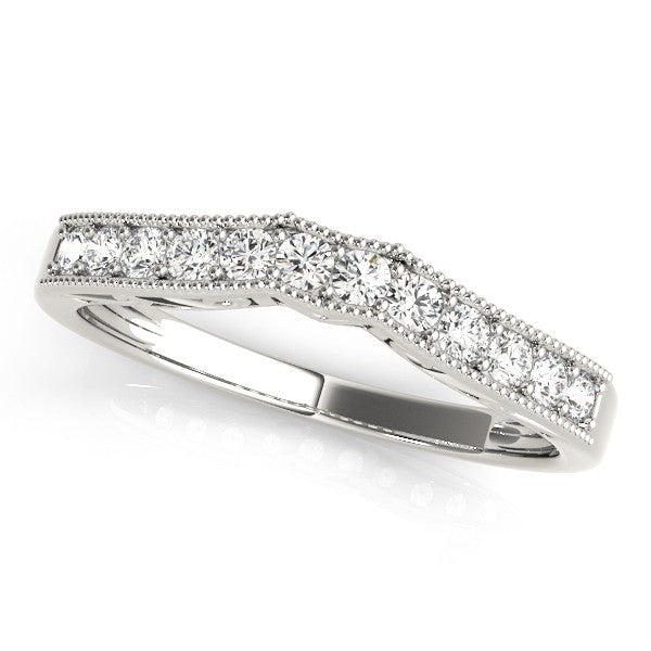 This exquisite Milgrain Round Diamond Pavé Chevron Band features a stunning array of round diamonds meticulously set in a pavé setting, accentuated by intricate milgrain detailing along the edges. The chevron design adds a unique twist to the classic band, making it a perfect choice for those who appreciate elegance with a modern flair. Crafted in a sleek metal finish, this band is designed to complement any engagement ring or stand alone as a statement piece.