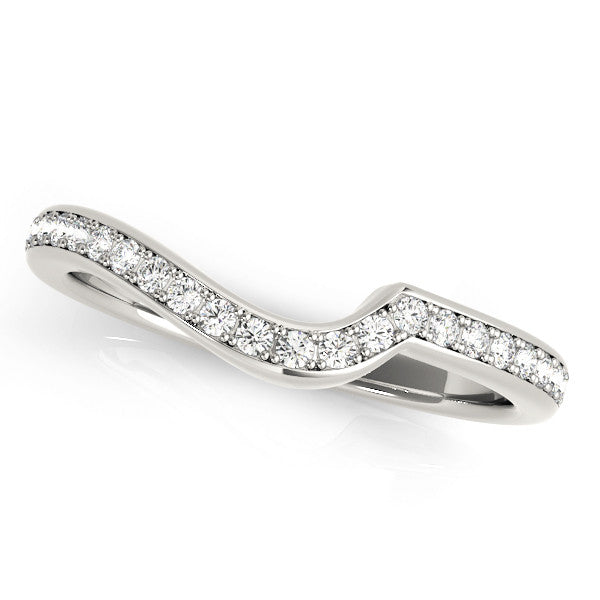 This elegant wedding band features a graceful curved design, perfectly contoured to complement an engagement ring. Adorned with round brilliant diamonds in a pavé setting, the stones are securely held in a channel setting, allowing maximum sparkle and brilliance. Crafted in a sleek metal finish, this band combines timeless elegance with a modern twist, making it a perfect choice for those seeking a sophisticated and harmonious addition to their bridal set.