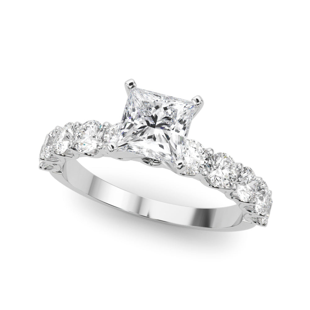 Platinum Princess Diamond Prong Setting with Side Stones on a Pave Band
