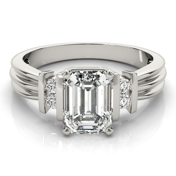 This exquisite ring features a captivating emerald-cut center stone, elegantly flanked by two round brilliant diamonds in a sophisticated three-stone design. The stones are securely held in place with sleek bar prongs, enhancing their brilliance and ensuring a modern, streamlined look. The band is crafted with a channel setting, adding a touch of contemporary elegance, while providing a comfortable fit. This ring is a perfect blend of classic allure and modern sophistication, ideal for those who appreciate timeless beauty with a modern twist.