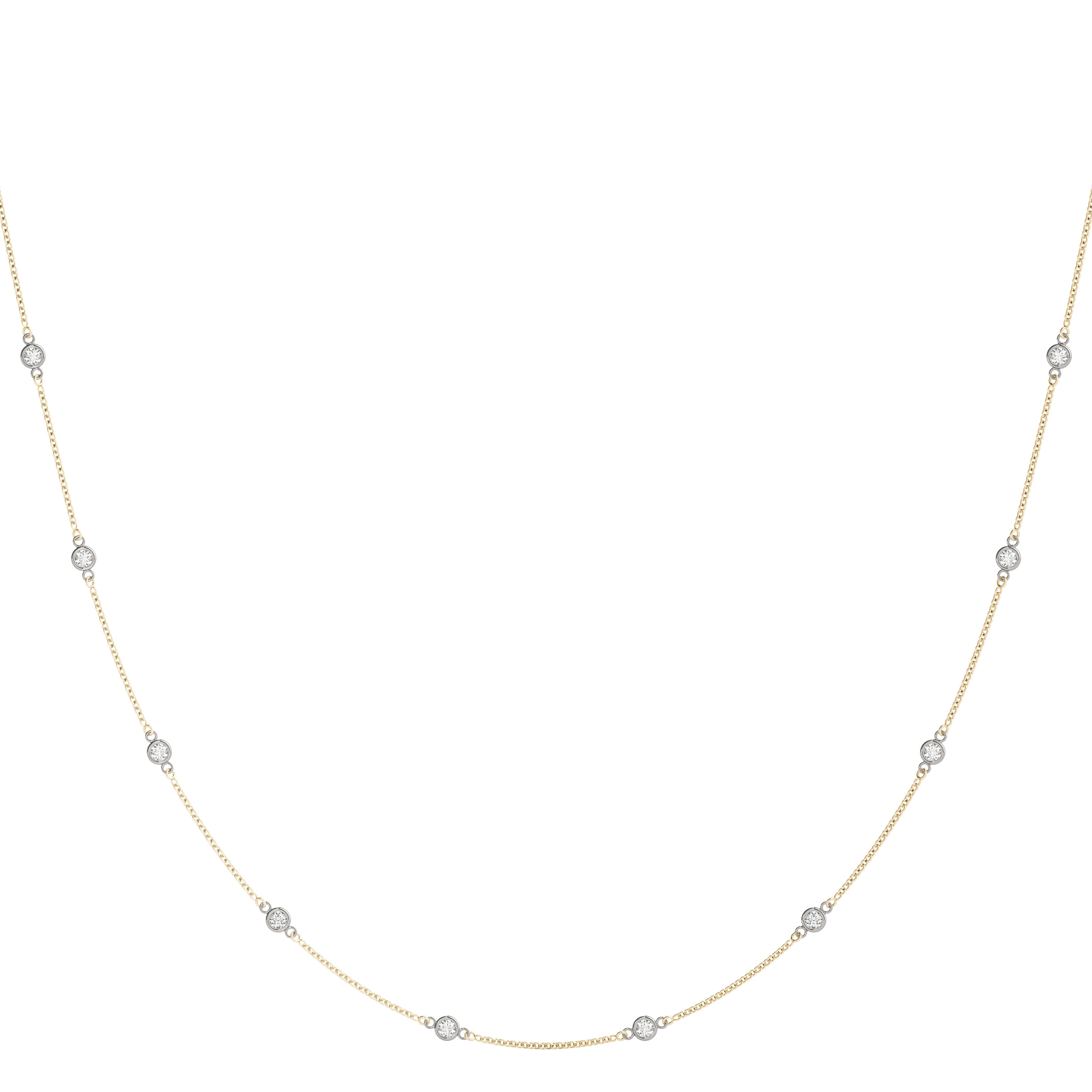 This elegant necklace features a series of round diamonds, each securely encased in a bezel setting, creating a seamless and sophisticated look. The diamonds are evenly spaced along a delicate cable chain, adding a touch of sparkle and refinement to any outfit. The minimalist design, combined with the timeless appeal of round diamonds, makes this necklace a versatile accessory for both everyday wear and special occasions.