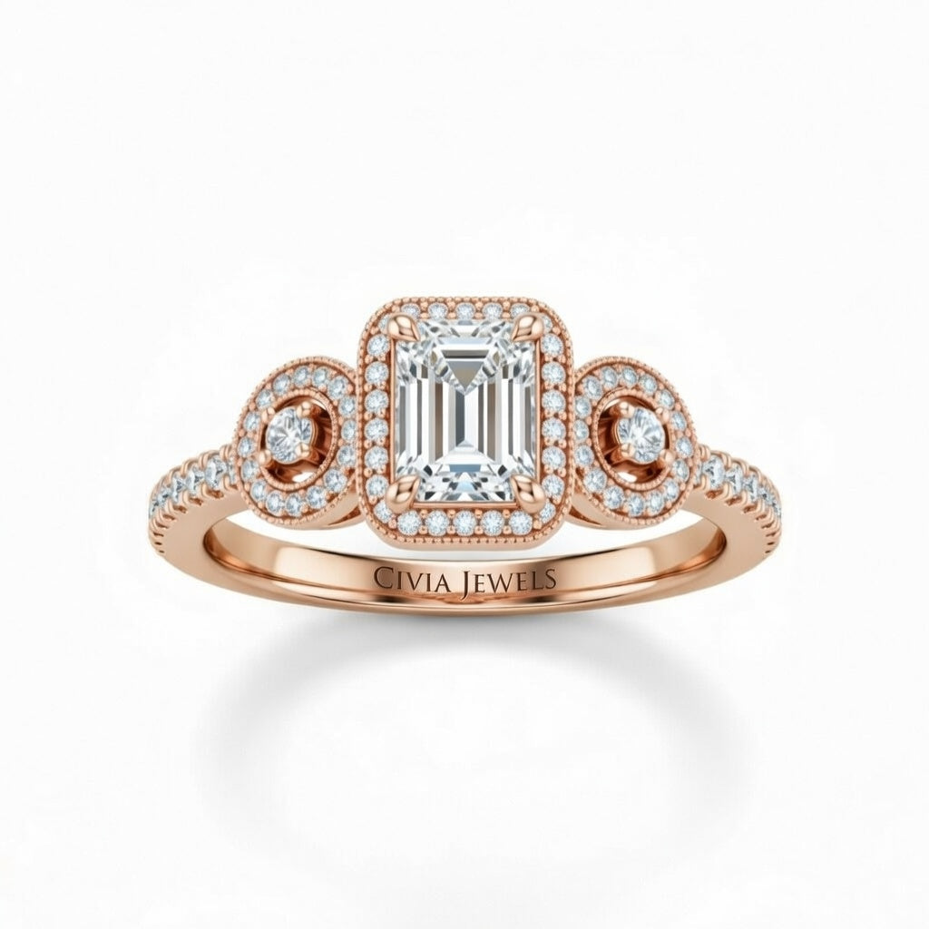 Rose Gold Emerald Brilliant Three Stone Halo Engagement Ring With Vintage Milgrain Detail