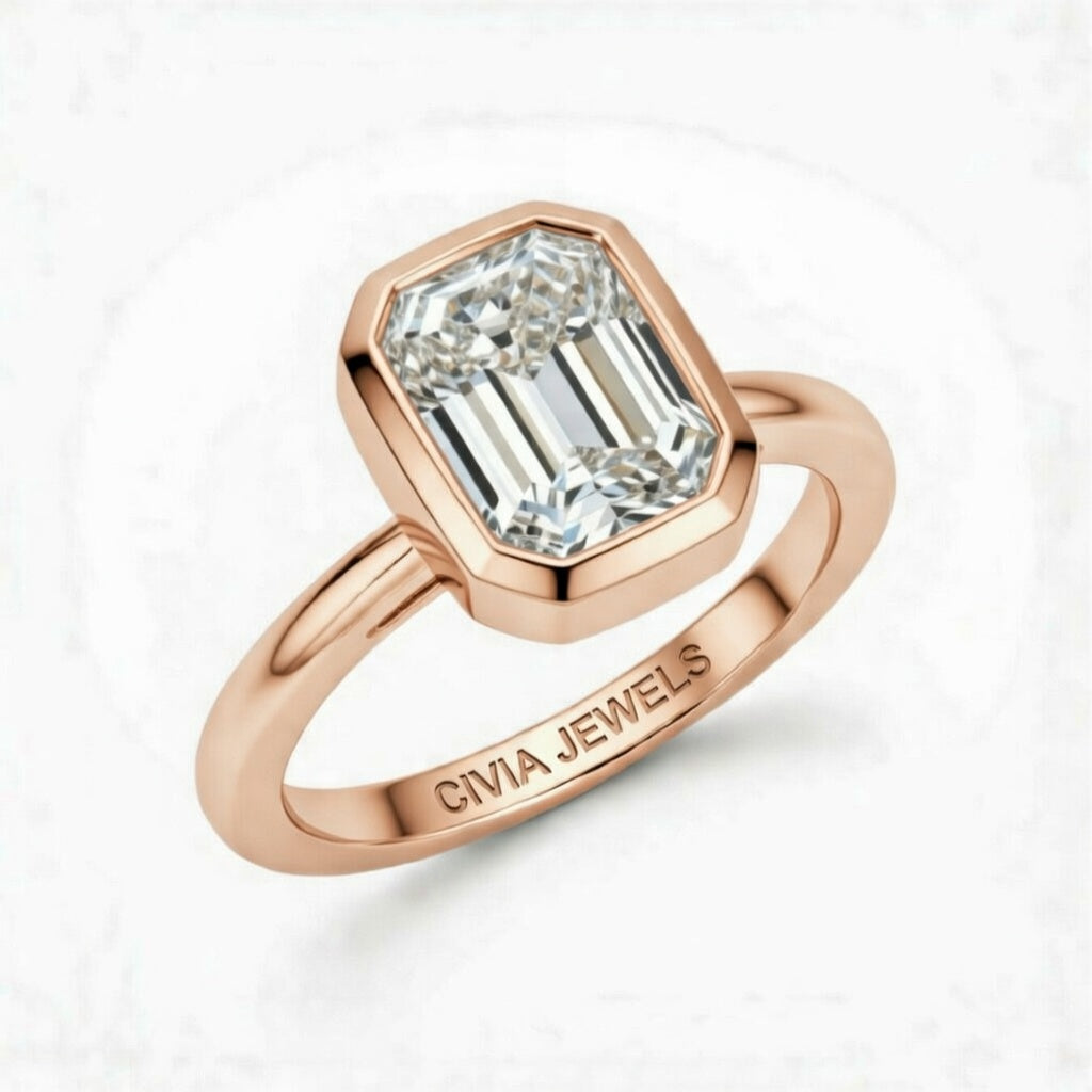 Rose Gold Emerald Cut Bezel Set Solitaire Engagement Ring with Polished Comfort Fit Band