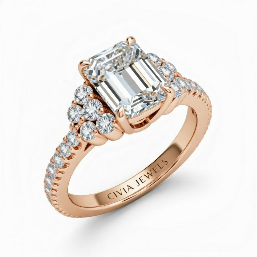 Rose Gold Emerald Cut Engagement Ring With Diamond Cluster Side Accents And Pavé Band