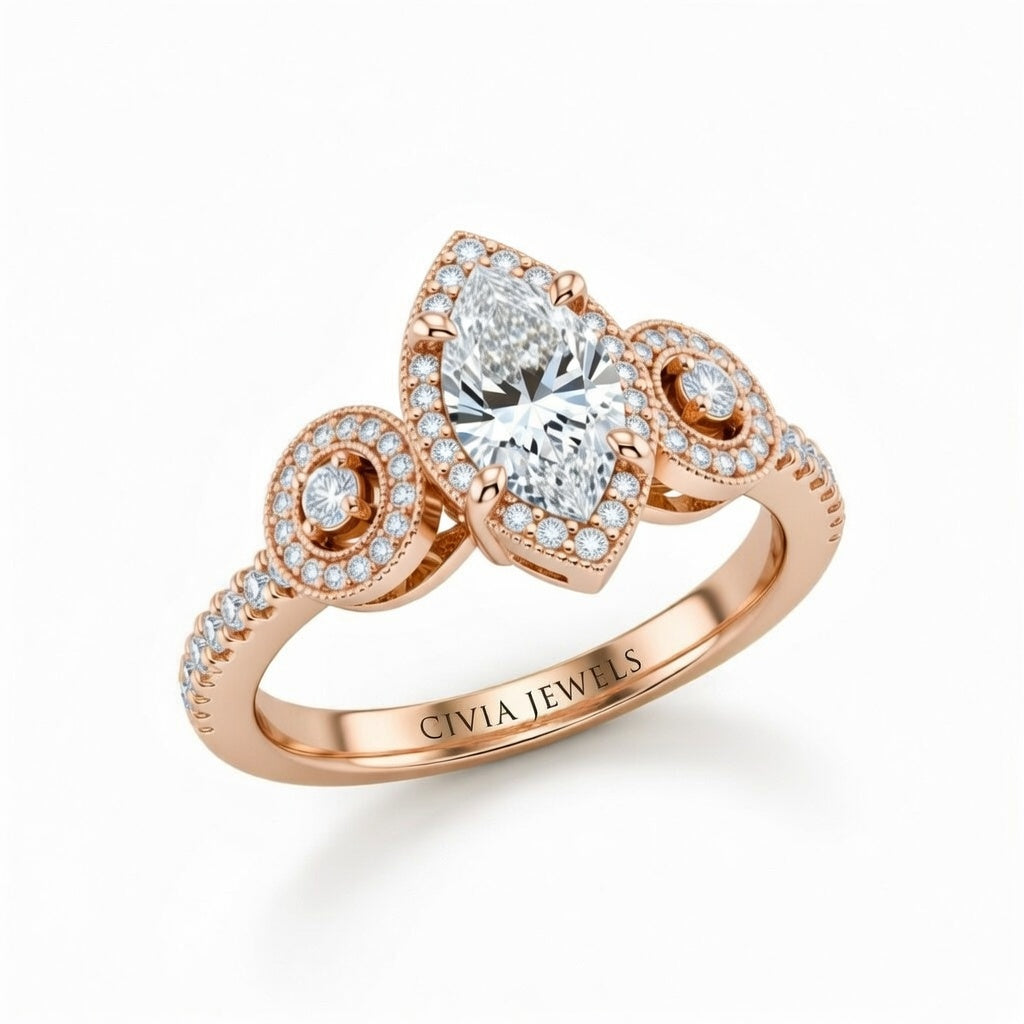 Rose Gold Marquise Brilliant Three Stone Halo Engagement Ring With Vintage Milgrain Detail