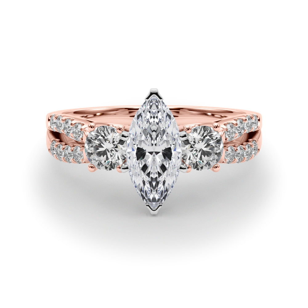 Rose gold Marquise Three-Stone Diamond Ring with Pavé Split Shank and Four-Prong Setting