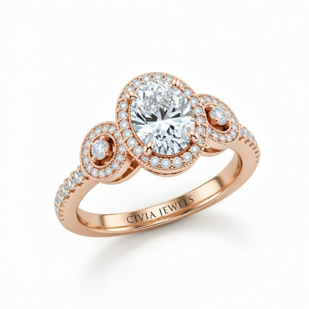 Rose Gold Oval Brilliant Three Stone Halo Engagement Ring With Vintage Milgrain Detail