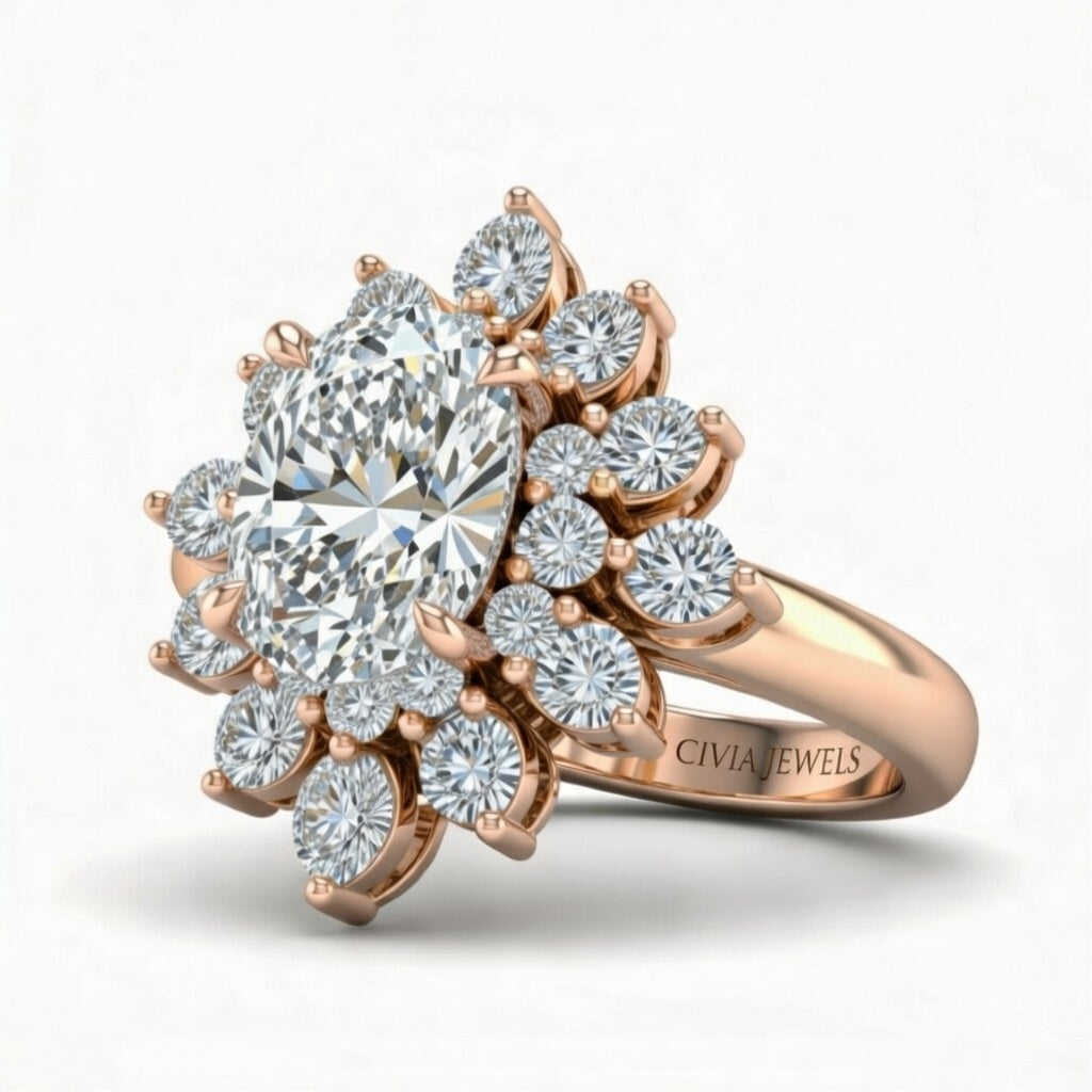 Rose Gold Oval Cut Cluster Halo Engagement Ring With Floral Diamond Frame Rose Gold Oval Cut Cluster Halo Engagement Ring With Floral Diamond Frame