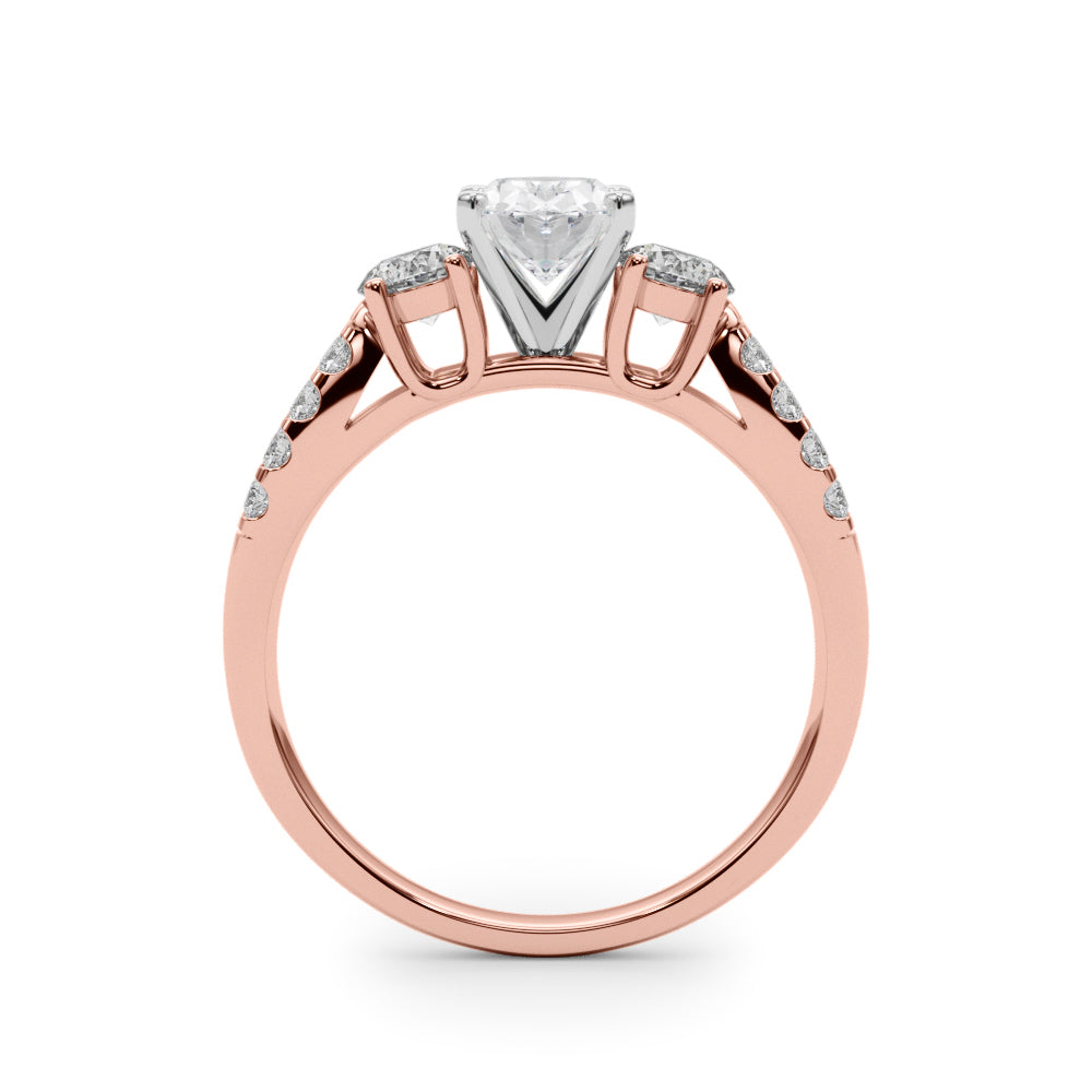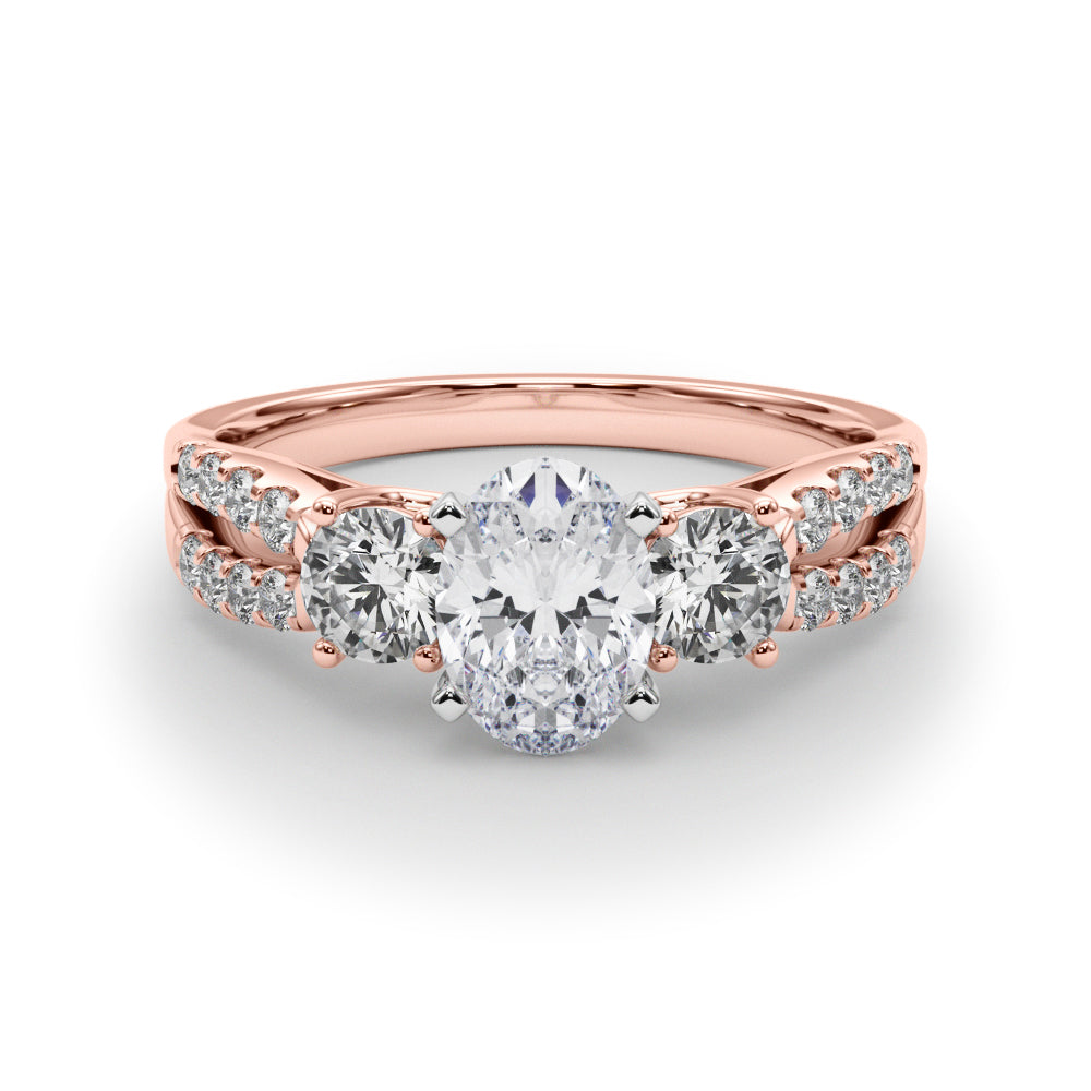 Rose gold Oval Three-Stone Diamond Ring with Pavé Split Shank and Four-Prong Setting