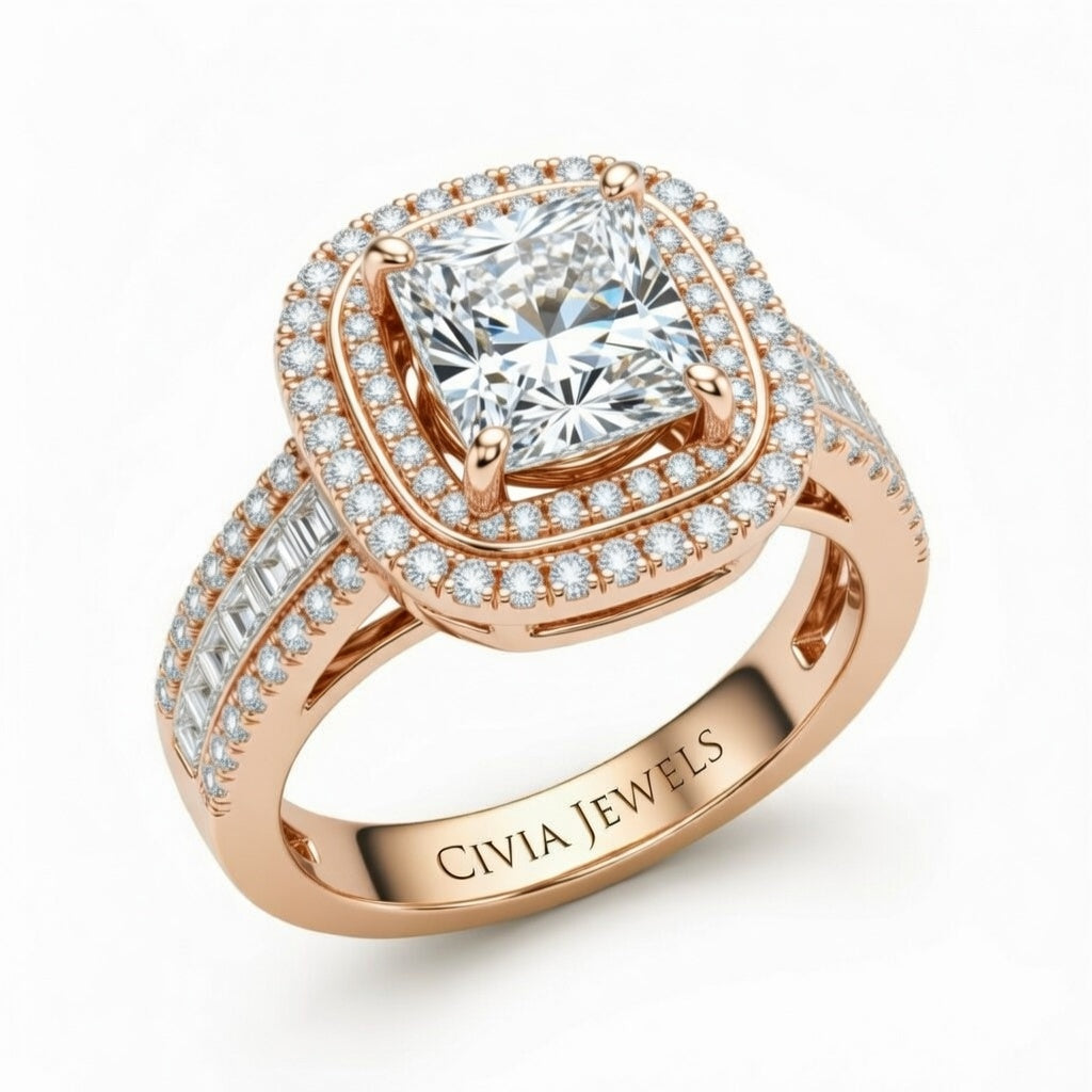 Rose Gold Princess Cut Double Halo Engagement Ring With Diamond Baguette Accented Pavé Band Rose Gold Princess Cut Double Halo Engagement Ring With Diamond Baguette Accented Pavé Band