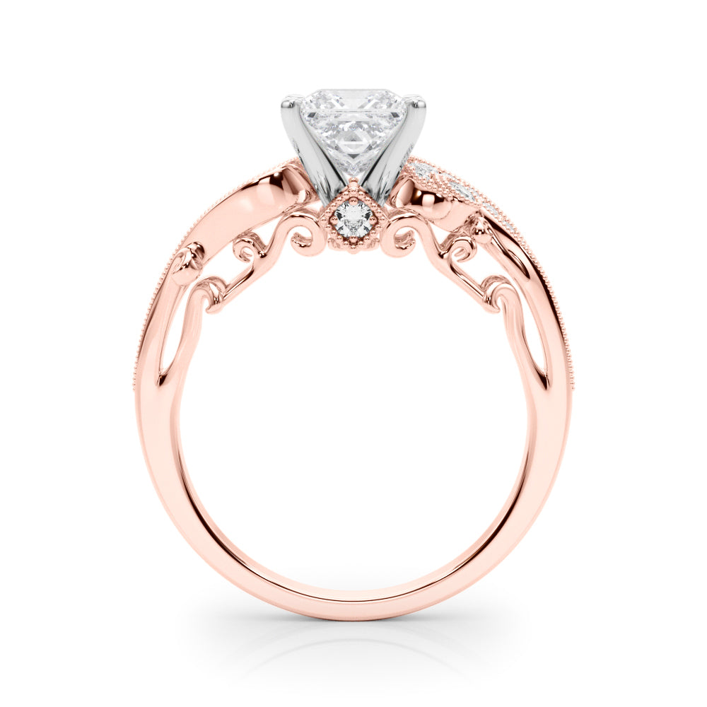 Rose gold Princess Solitaire with Milgrain Pave Band and Four-Prong Setting
