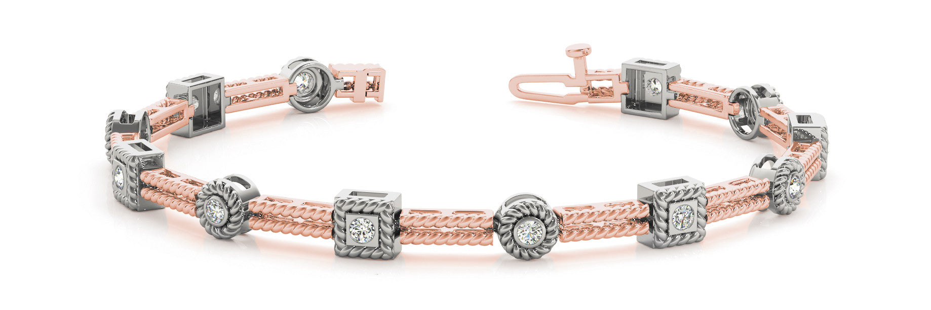 This exquisite bracelet features a stunning array of round diamonds, each securely nestled in a bezel setting that enhances their brilliance. The diamonds are elegantly arranged along a sophisticated rope chain band, adding a touch of texture and luxury to the design. The bracelet is crafted with meticulous attention to detail, ensuring that each stone is perfectly aligned and held in place with a secure prong setting. Ideal for special occasions or adding a touch of elegance to everyday wear, this bracelet is a timeless piece that embodies both classic style and modern sophistication.