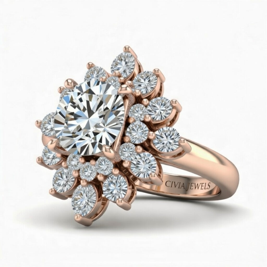 Rose Gold Round Cut Cluster Halo Engagement Ring With Floral Diamond Frame