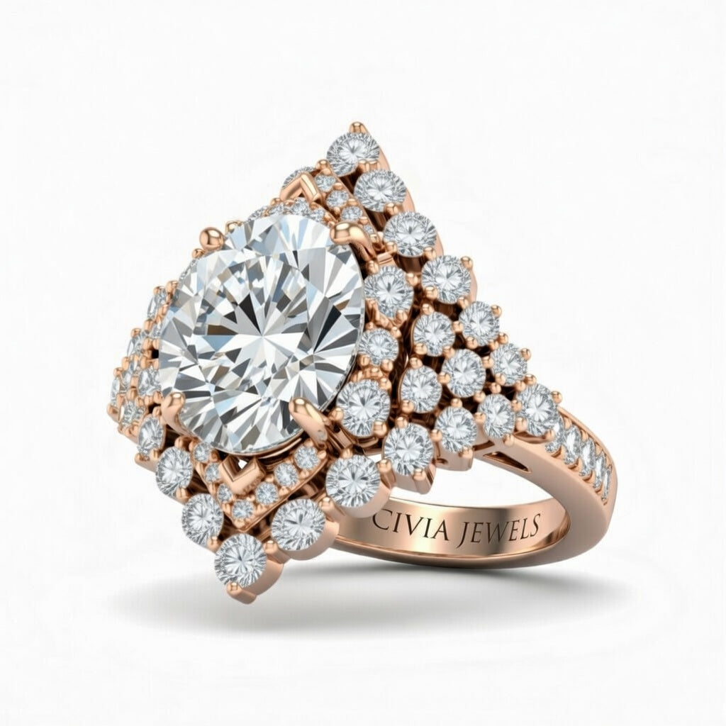 Rose Gold Round Cut Engagement Ring With Diamond Cluster Sides, Double Halo Frame And Pavé Shank