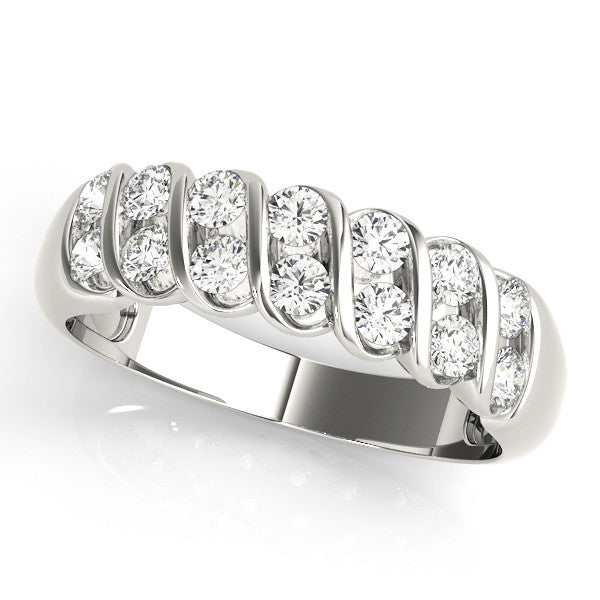 This exquisite band features a channel setting with round brilliant diamonds, elegantly arranged in a multi-row design. The polished metal band enhances the sparkle of the stones, while the secure channel setting ensures durability and comfort. Perfect for any occasion, this band combines timeless elegance with modern sophistication, making it a stunning addition to any jewelry collection.
