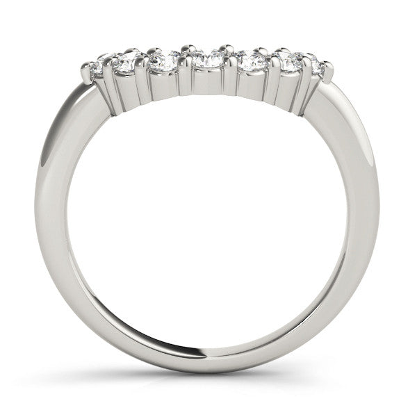 This elegant band features a graceful curved design, adorned with round brilliant diamonds set in a classic pavé style. The stones are securely held in place by a prong setting, enhancing their sparkle and brilliance. Crafted from high-quality metal, this band is both stylish and durable, making it a perfect choice for weddings, anniversaries, or any special occasion.