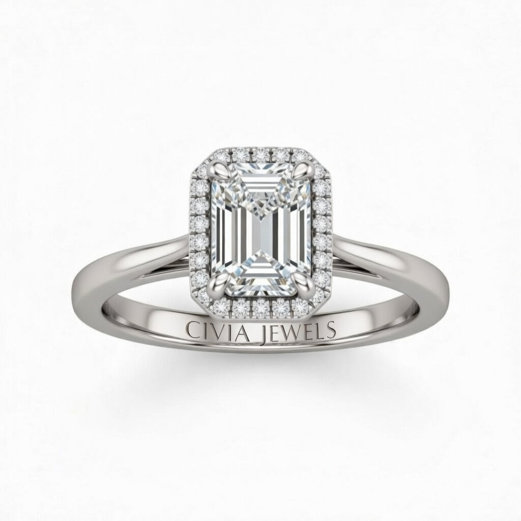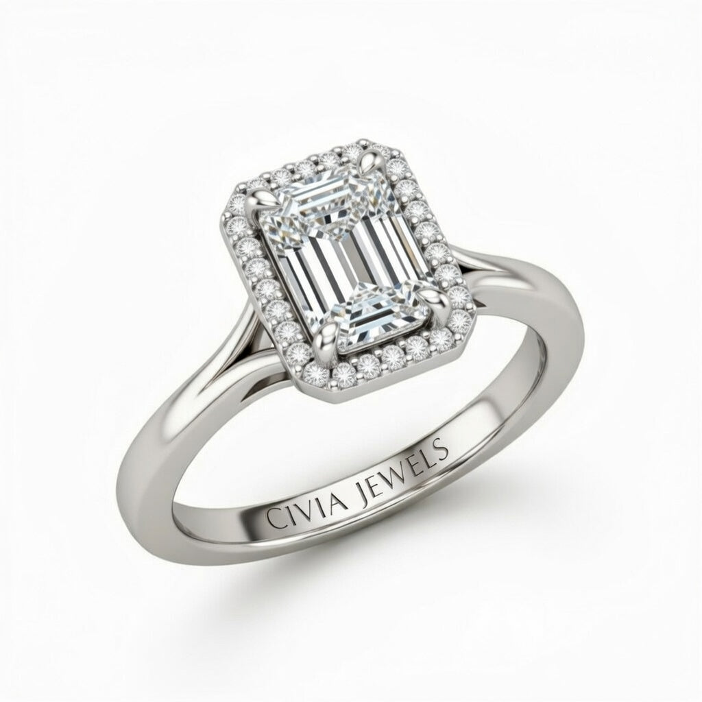 Silver Emerald Cut Halo Engagement Ring With Classic Four Prong Setting And Slim Band