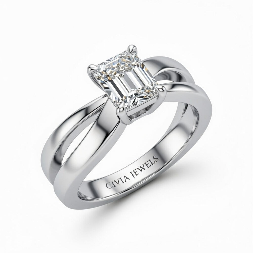 Silver Emerald Cut Solitaire Engagement Ring With Sculpted Multirow Twist Shank