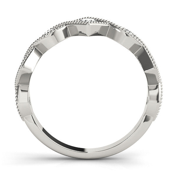 This exquisite band features a captivating design with alternating marquise and square shapes, each adorned with brilliant round diamonds. The stones are securely held in place with a bezel setting, enhancing their sparkle and providing a smooth, elegant finish. The band is crafted with a milgrain edge, adding a vintage touch to its contemporary style. Perfect for those who appreciate intricate detailing and timeless elegance, this ring is an ideal choice for any special occasion.