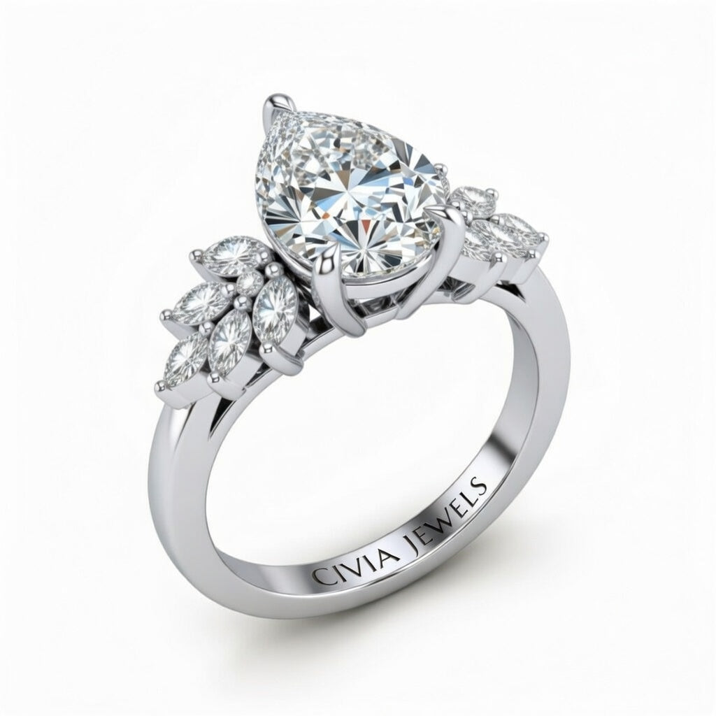 Silver Pear Cut Engagement Ring With Marquise Diamond Cluster Side Accents Silver Pear Cut Engagement Ring With Marquise Diamond Cluster Side Accents