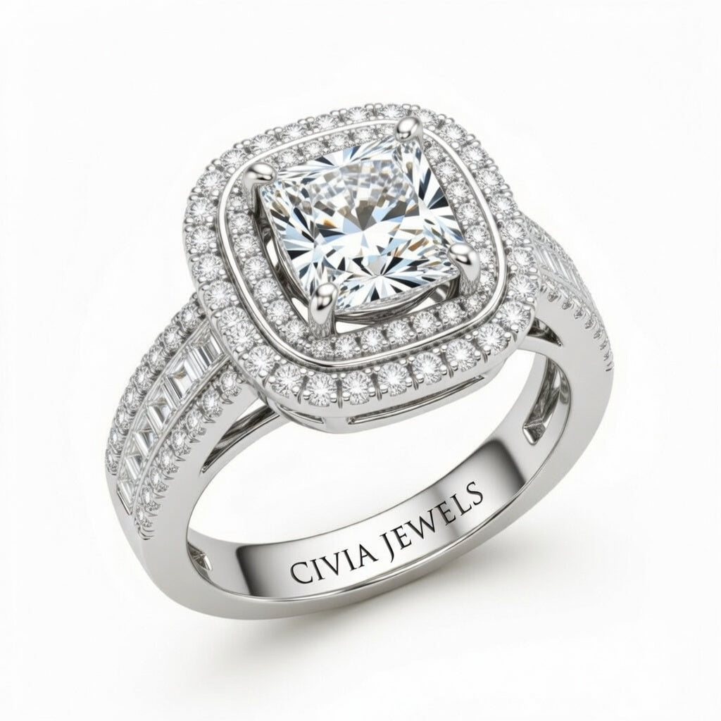 Silver Cushion Cut Double Halo Engagement Ring With Diamond Baguette Accented Pavé Band