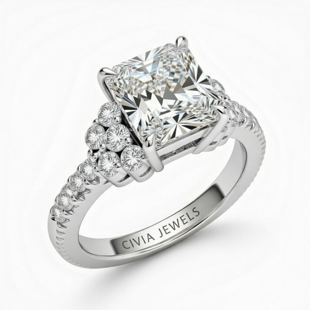 Silver Radiant Cut Engagement Ring With Diamond Cluster Side Accents And Pavé Band Silver Radiant Cut Engagement Ring With Diamond Cluster Side Accents And Pavé Band