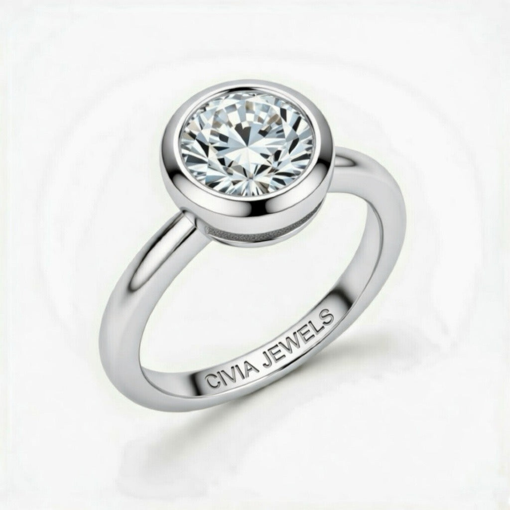 Silver Round Cut Bezel Set Solitaire Engagement Ring with Polished Comfort Fit Band