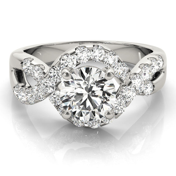 This exquisite ring features a stunning round cut diamond at its center, elegantly embraced by a halo of smaller diamonds that enhance its brilliance. The unique twist band design is adorned with additional diamonds, creating a continuous sparkle that captivates from every angle. Set in a secure four-prong setting, the center stone is both highlighted and protected, making this ring a perfect blend of elegance and durability. Ideal for engagements or special occasions, this ring is a timeless symbol of love and commitment.
