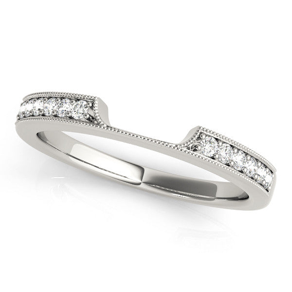 This exquisite contour band features a delicate row of round cut diamonds set in a pavé style, gracefully accentuated by intricate milgrain detailing along the edges. Designed to perfectly complement an engagement ring, its unique contour shape allows for a seamless fit. Crafted from lustrous metal, this band offers both elegance and sophistication, making it an ideal choice for those seeking a harmonious blend of tradition and modernity in their jewelry collection.