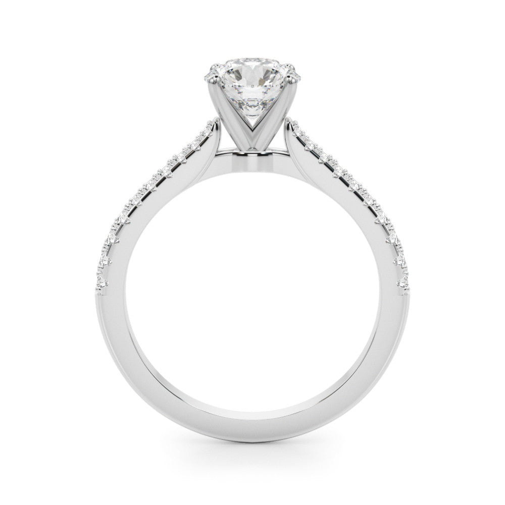 Silver Round Cut Solitaire Diamond Engagement Ring with Pave Band and Four-Prong Setting