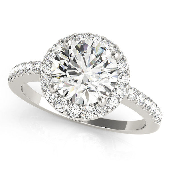 Silver Round Halo Diamond Engagement Ring with Pavé Band and Four-Prong Setting