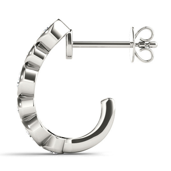 These exquisite earrings feature a series of round brilliant diamonds, each securely encased in a classic bezel setting. The stones are elegantly arranged along a sleek hoop band, offering a timeless and sophisticated look. The bezel setting enhances the diamonds' brilliance while providing a modern touch, making these earrings a perfect accessory for any occasion. Crafted with precision, the hoop design ensures comfort and style, allowing the diamonds to sparkle from every angle.