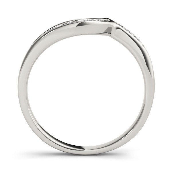 This exquisite contour band features a sleek channel setting that gracefully holds round brilliant diamonds, creating a seamless line of sparkle. The band is crafted in polished white gold, designed to perfectly complement an engagement ring. Its unique contour shape allows it to nestle closely against another ring, enhancing its brilliance. Ideal for those seeking a modern yet elegant look, this band is both stylish and versatile, making it a perfect choice for any occasion.