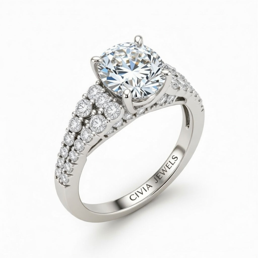 Silver Round Cut Double Halo Engagement Ring With Four Prong Setting And Diamond Pavé Split Band