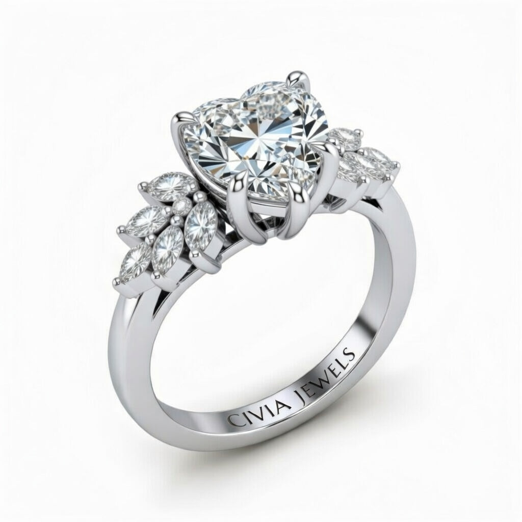 White Gold Heart Cut Engagement Ring With Marquise Diamond Cluster Side Accents White Gold Heart Cut Engagement Ring With Marquise Diamond Cluster Side Accents
