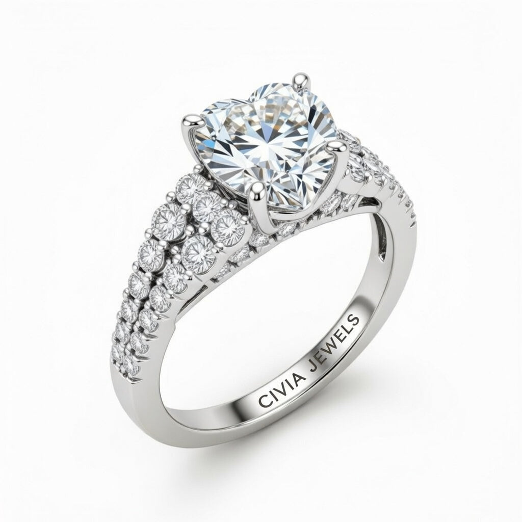 White Gold Heart Cut Solitaire Engagement Ring With Pavé Diamond Band And Classic Four-Prong Setting