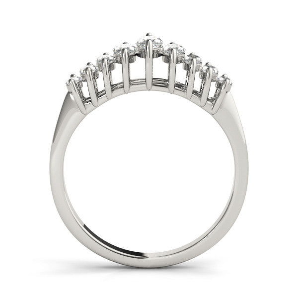 This elegant curved band features a stunning array of marquise-cut diamonds, each securely held in place with a classic prong setting. The sleek design of the band enhances the brilliance of the stones, making it a perfect choice for those who appreciate timeless elegance. Crafted from high-quality materials, this band is designed to complement both engagement rings and other stackable bands, adding a touch of sophistication to any jewelry collection.