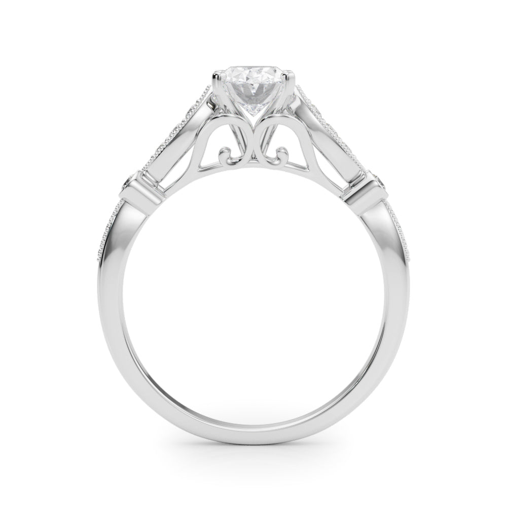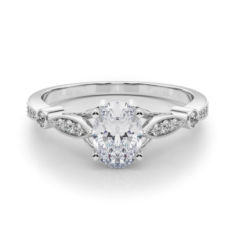 White gold Oval Cut Diamond with Milgrain Marquise and Bezel Accents on a Solitaire Band with Prong Setting