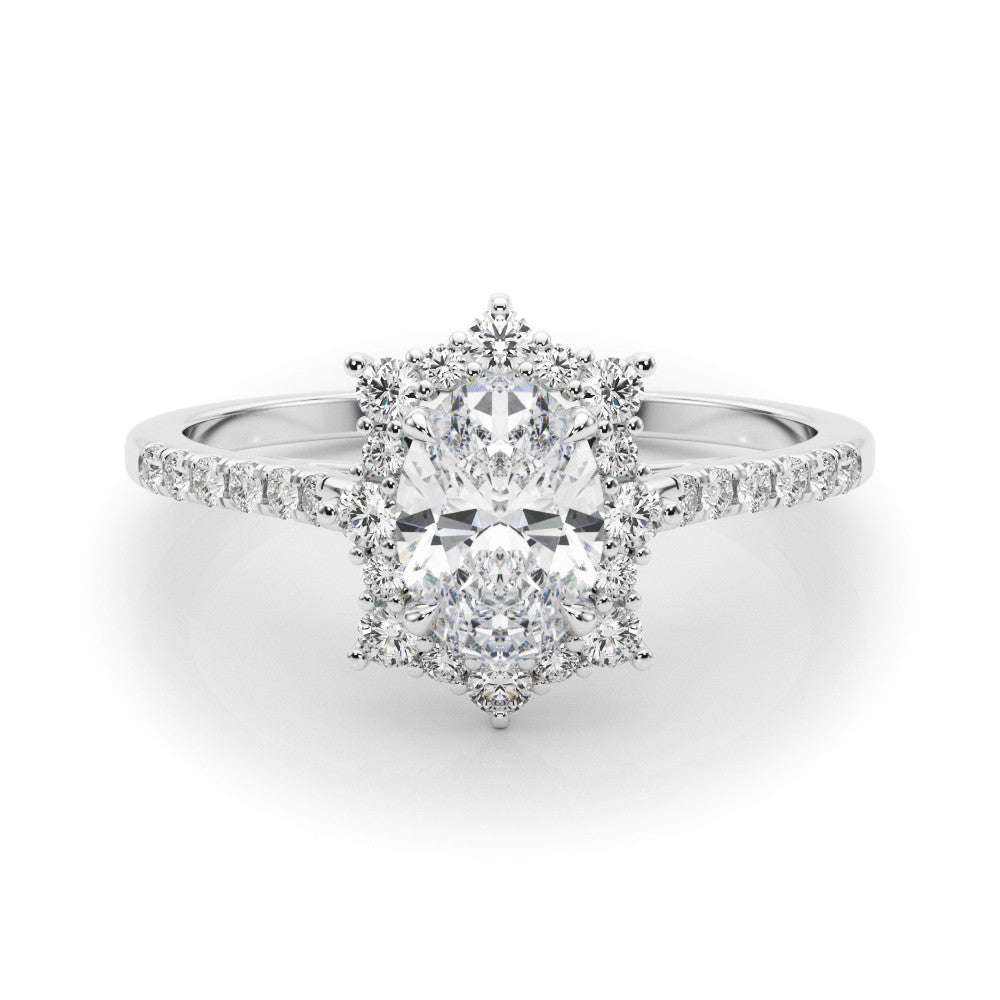 White gold Oval Halo Diamond Ring with Pavé Band and Prong Setting