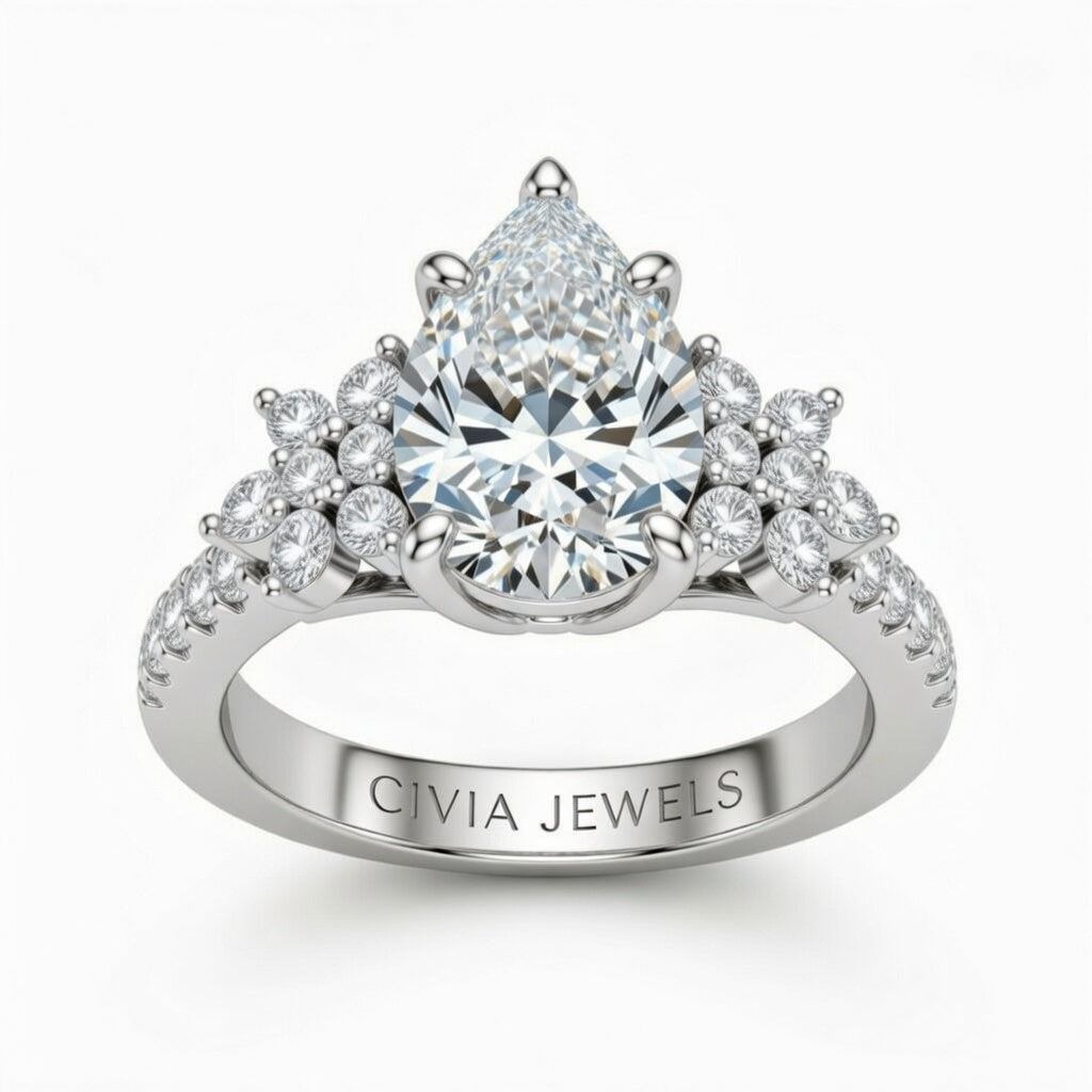 White Gold Pear Cut Engagement Ring With Floral Diamond Cluster Sides And Pavé Band