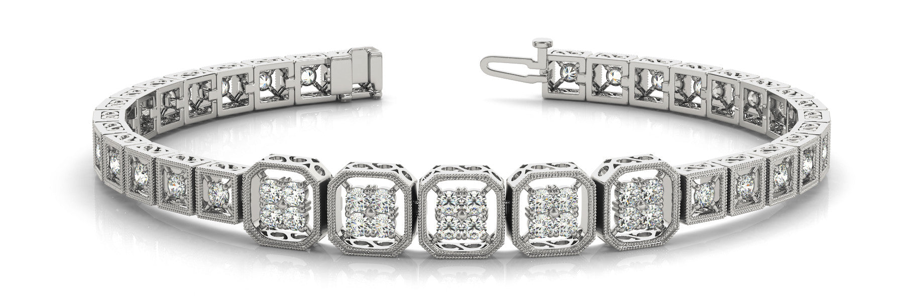 This exquisite bracelet features a series of dazzling princess-cut diamonds, each meticulously set in a milgrain bezel setting that enhances their brilliance and sparkle. The diamonds are linked together with a classic tennis band, offering both elegance and flexibility. The secure prong setting ensures that each stone is held firmly in place, making this bracelet a timeless piece suitable for any occasion.