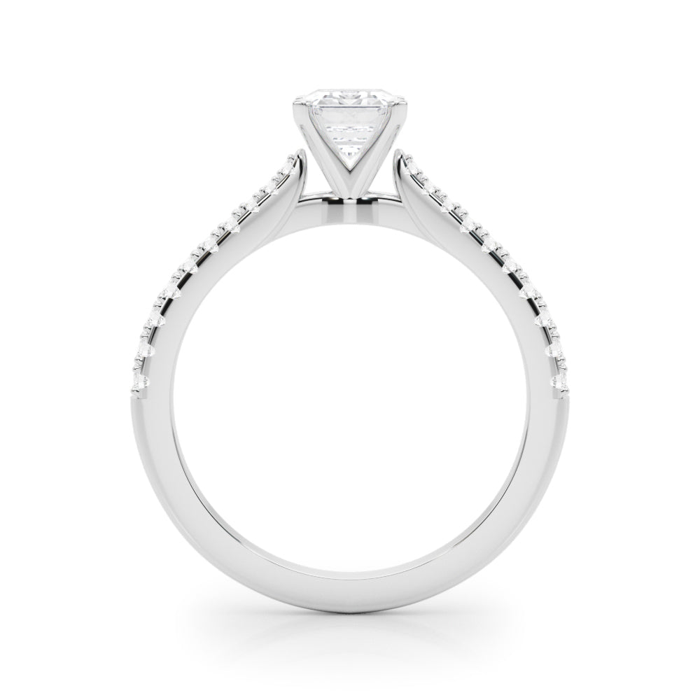 White gold Radiant Cut Solitaire Diamond Engagement Ring with Pave Band and Four-Prong Setting
