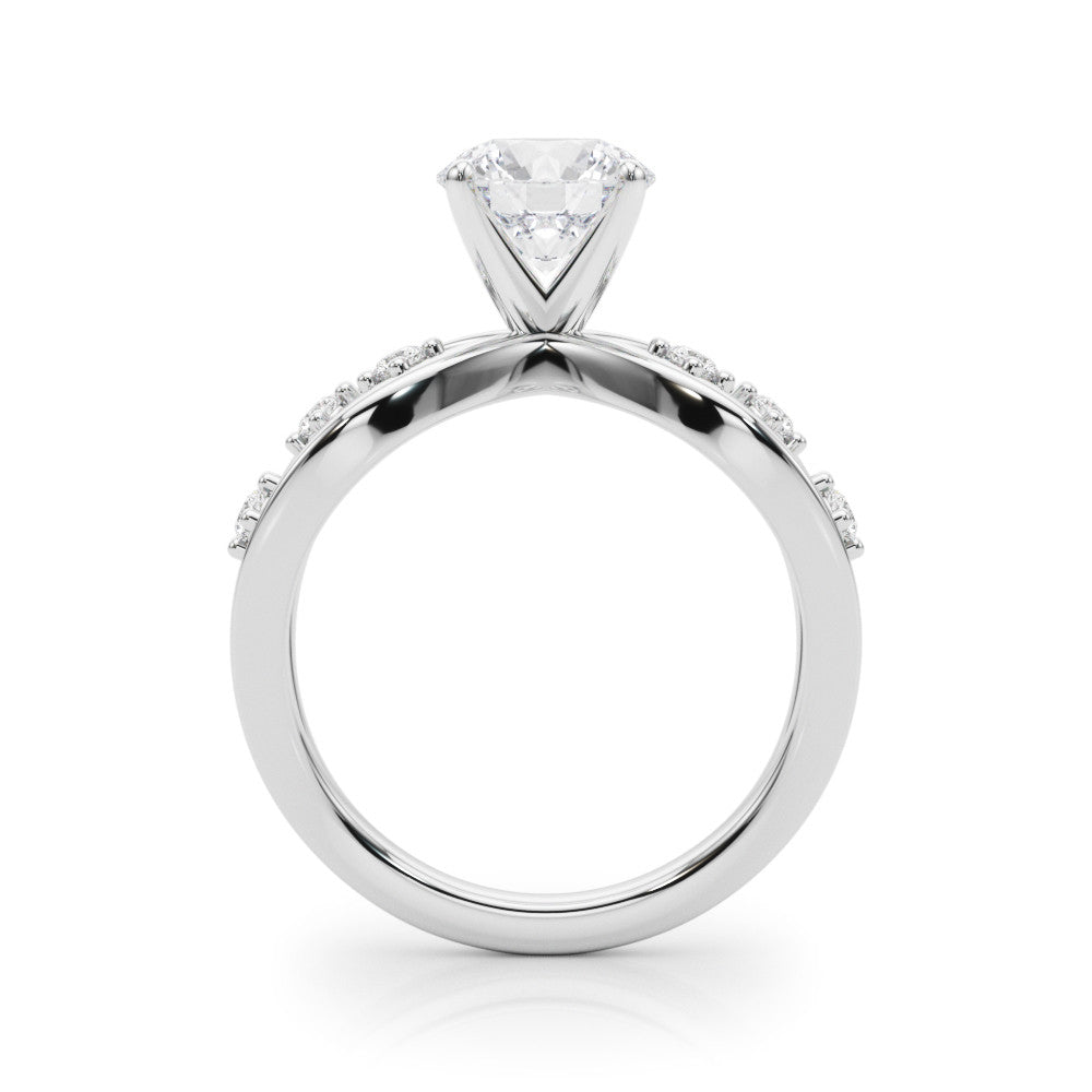 White gold Round Cut Solitaire Diamond with Side Stones on Criss-Cross Band and Four-Prong Setting