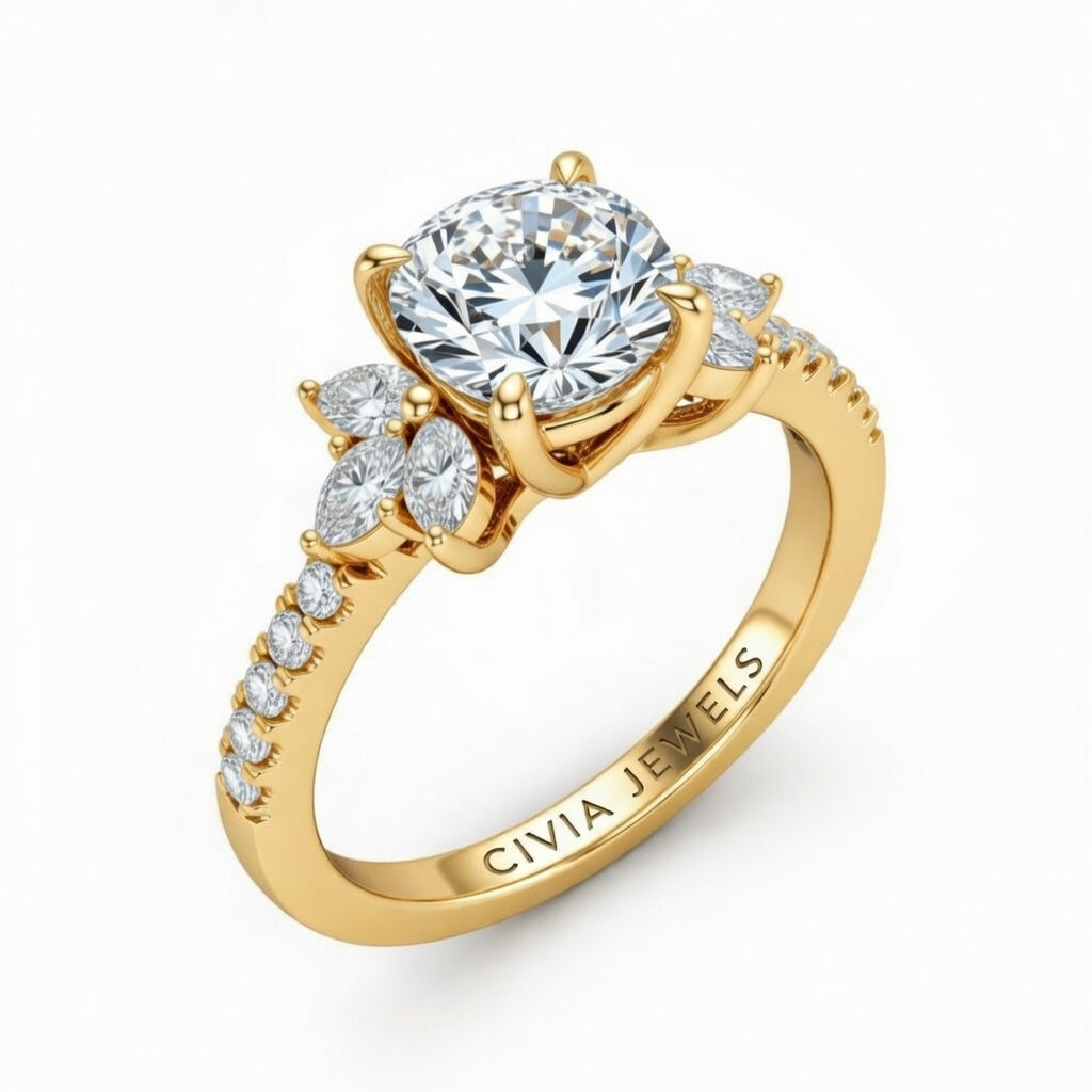 Yellow Gold Cushion Cut Engagement Ring With Marquise Diamond Floral Side Clusters And Pavé Band