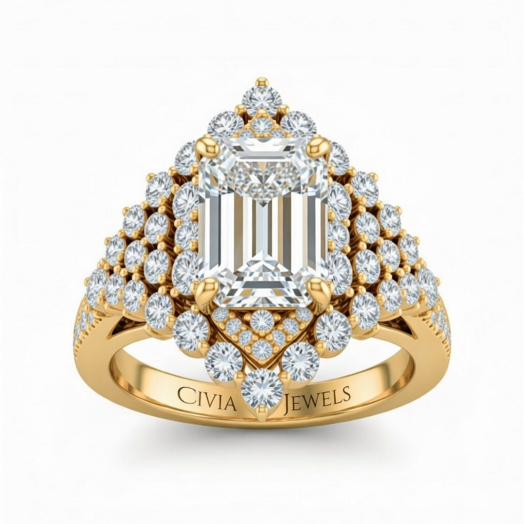 Yellow Gold Emerald Cut Engagement Ring With Diamond Cluster Sides, Double Halo Frame And Pavé Shank