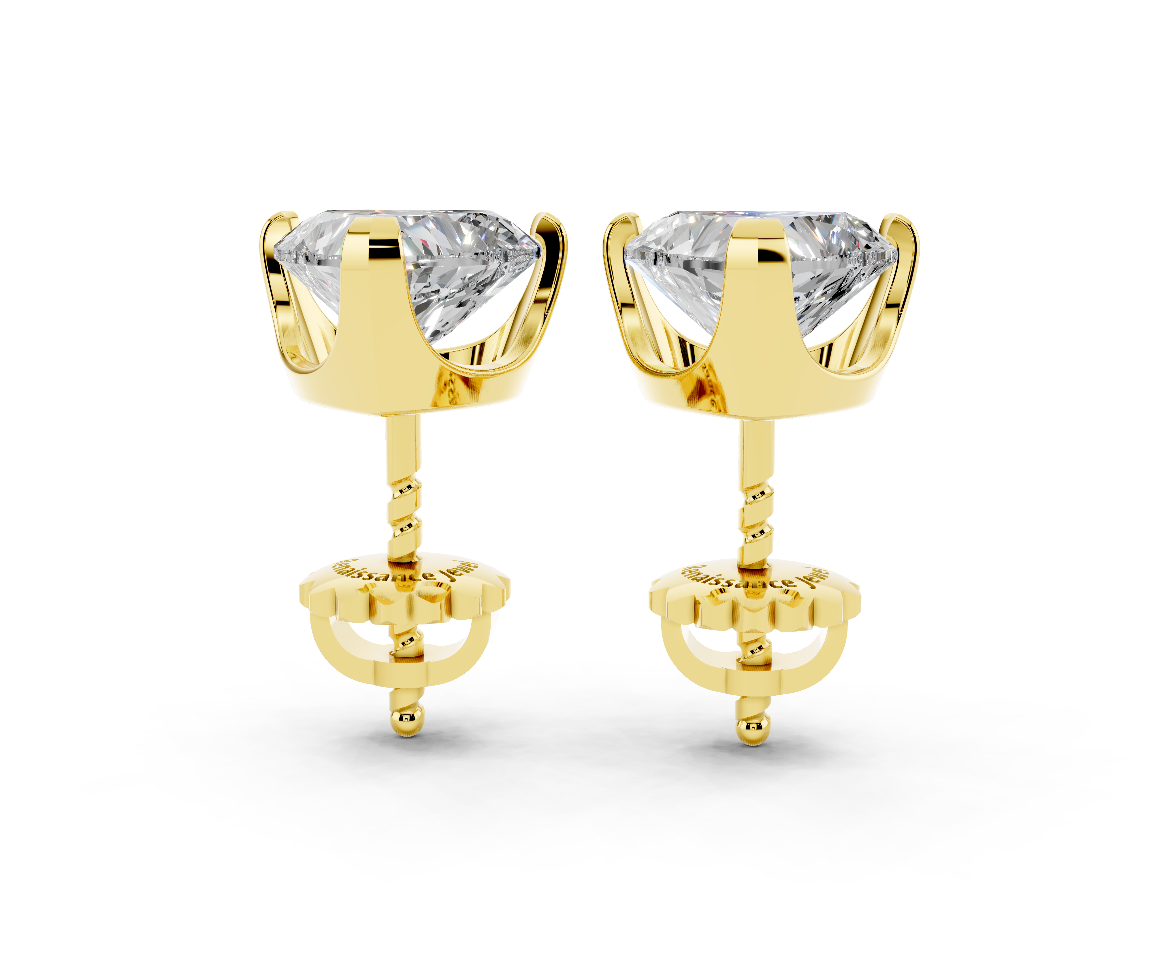 These exquisite earrings feature heart brilliant diamonds, each securely held in a classic four-prong basket setting. The stones are expertly cut to maximize their sparkle and brilliance, making them a timeless addition to any jewelry collection. Set in lustrous yellow gold, these stud earrings offer a perfect blend of elegance and sophistication, ideal for both everyday wear and special occasions. The secure push-back or screw-back closure ensures comfort and ease of wear, making these earrings a must-have for any jewelry enthusiast.