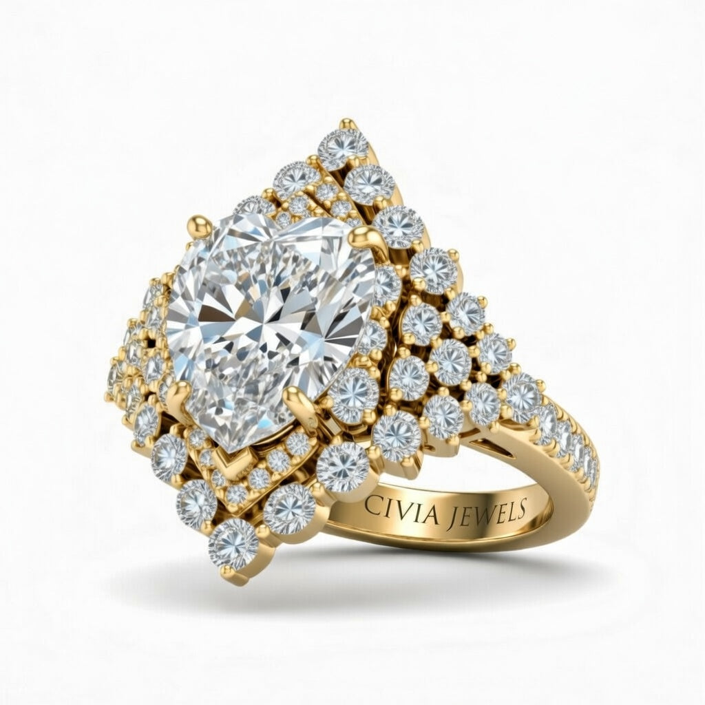 Yellow Gold Heart Cut Engagement Ring With Diamond Cluster Sides, Double Halo Frame And Pavé Shank Yellow Gold Heart Cut Engagement Ring With Diamond Cluster Sides, Double Halo Frame And Pavé Shank