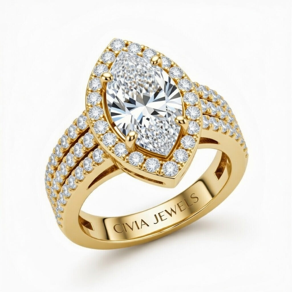 Yellow Gold Marquise Cut Double Halo Engagement Ring With Four Prong Setting And Diamond Pavé Split Band Yellow Gold Marquise Cut Double Halo Engagement Ring With Four Prong Setting And Diamond Pavé Split Band