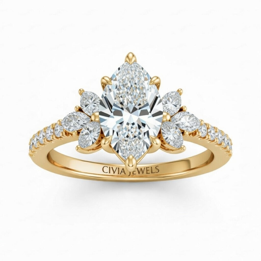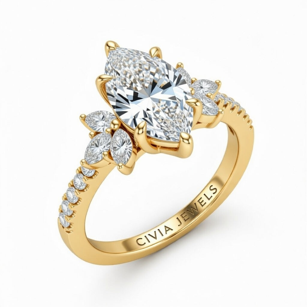 Yellow Gold Marquise Cut Engagement Ring With Marquise Diamond Floral Side Clusters And Pavé Band Yellow Gold Marquise Cut Engagement Ring With Marquise Diamond Floral Side Clusters And Pavé Band
