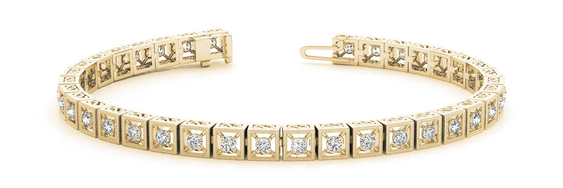 Yellow gold Milgrain Square Link Bracelet with Round Cut Diamonds in Bezel Setting